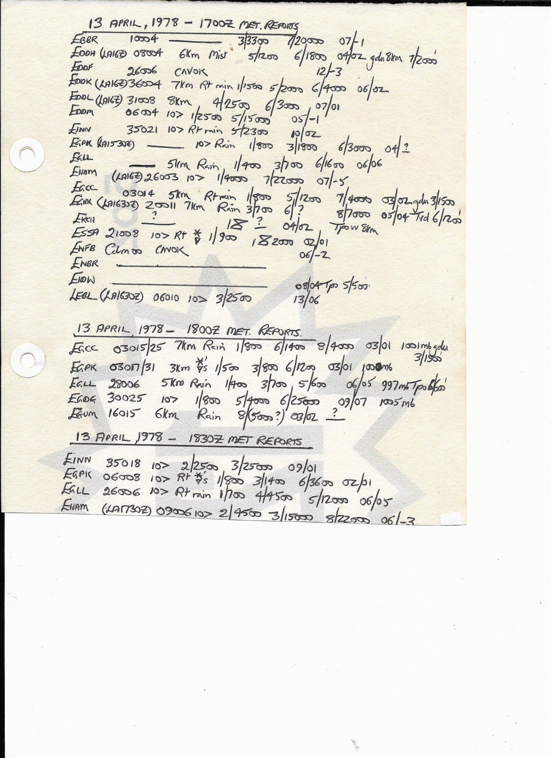 13 April, 1978: 1700Z & 1800Z European METARS
