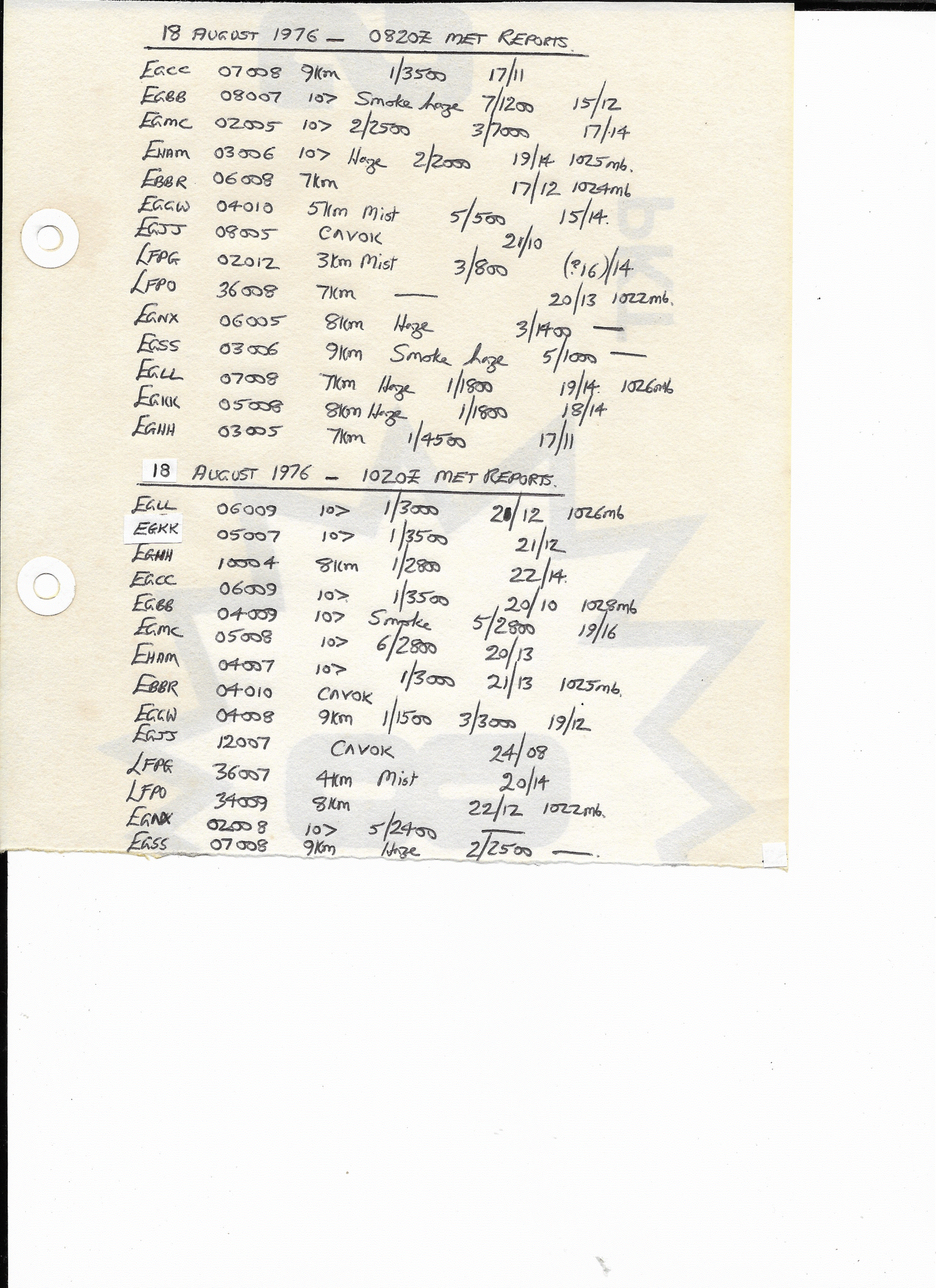 18 August, 1976: 0820Z & 1020Z European METARS