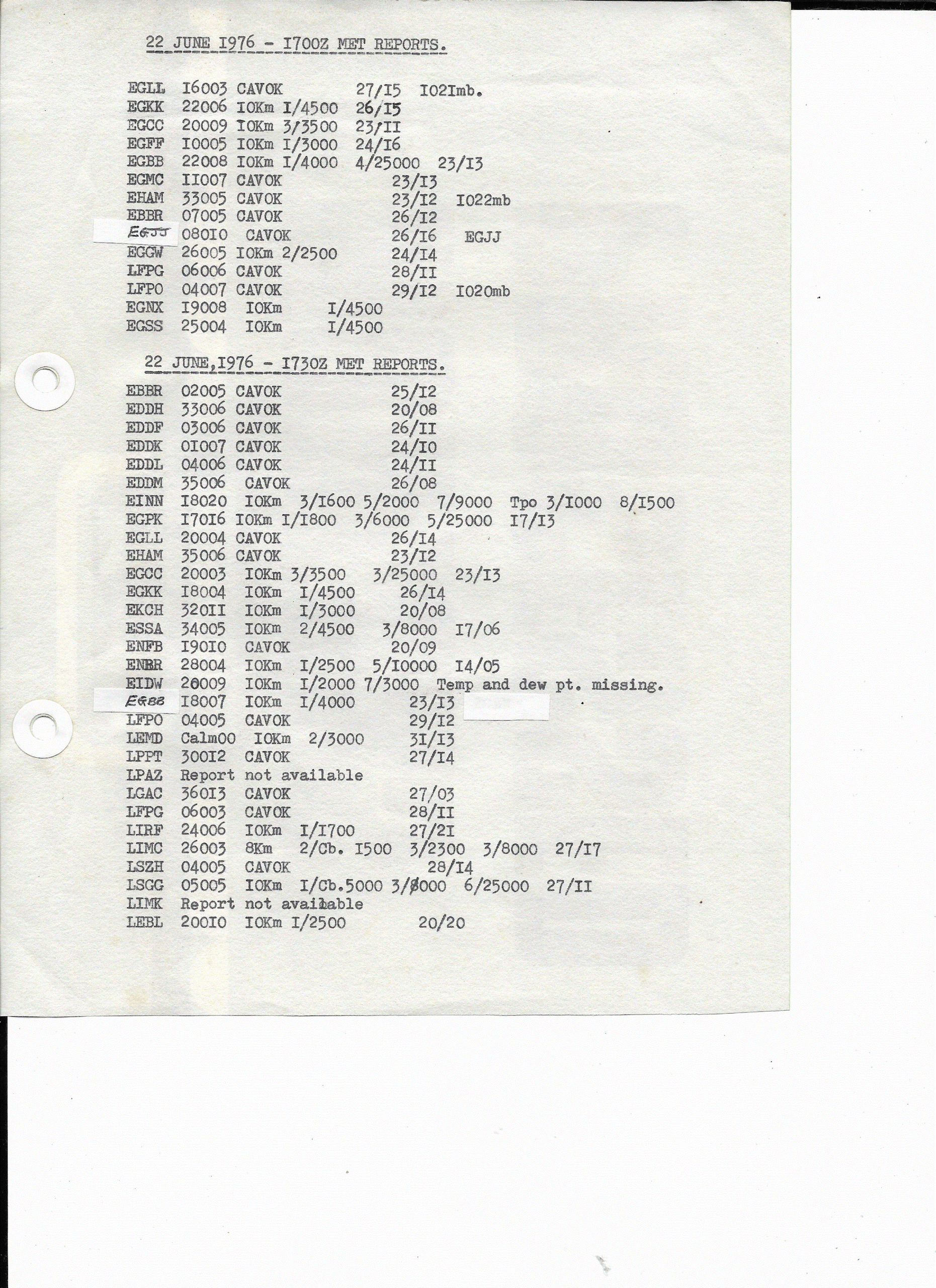 22 June, 1976: 1700Z & 1730Z European METARS