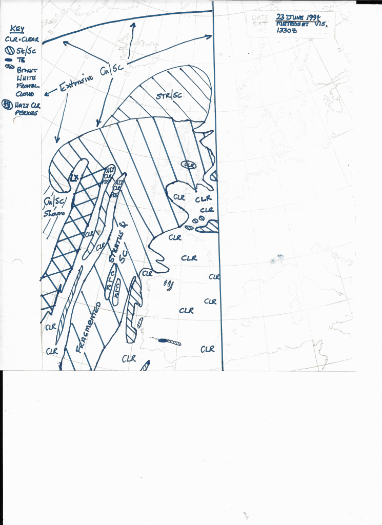23 June, 1994: 1330Z METEOSAT 5 Vis. Satellite Cloud Analysis