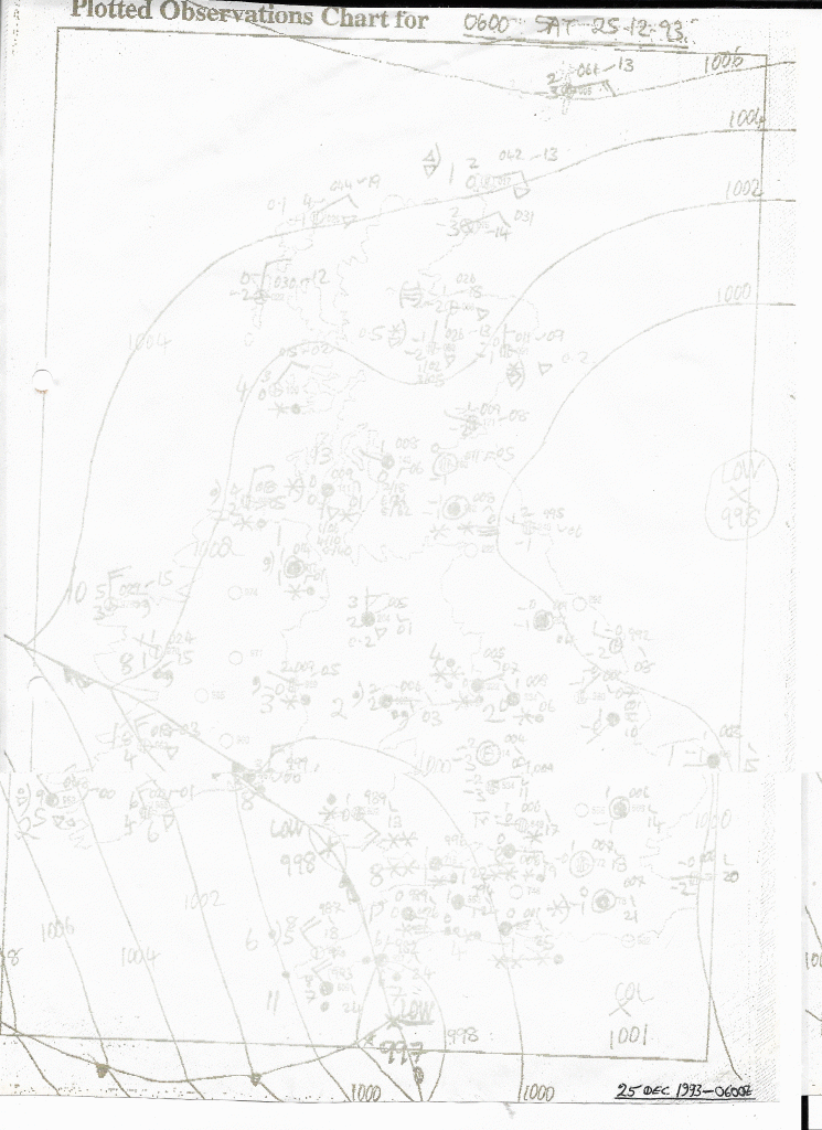 25 December, 1993: 0600Z Plotted Observations (from Cardiff Weather)