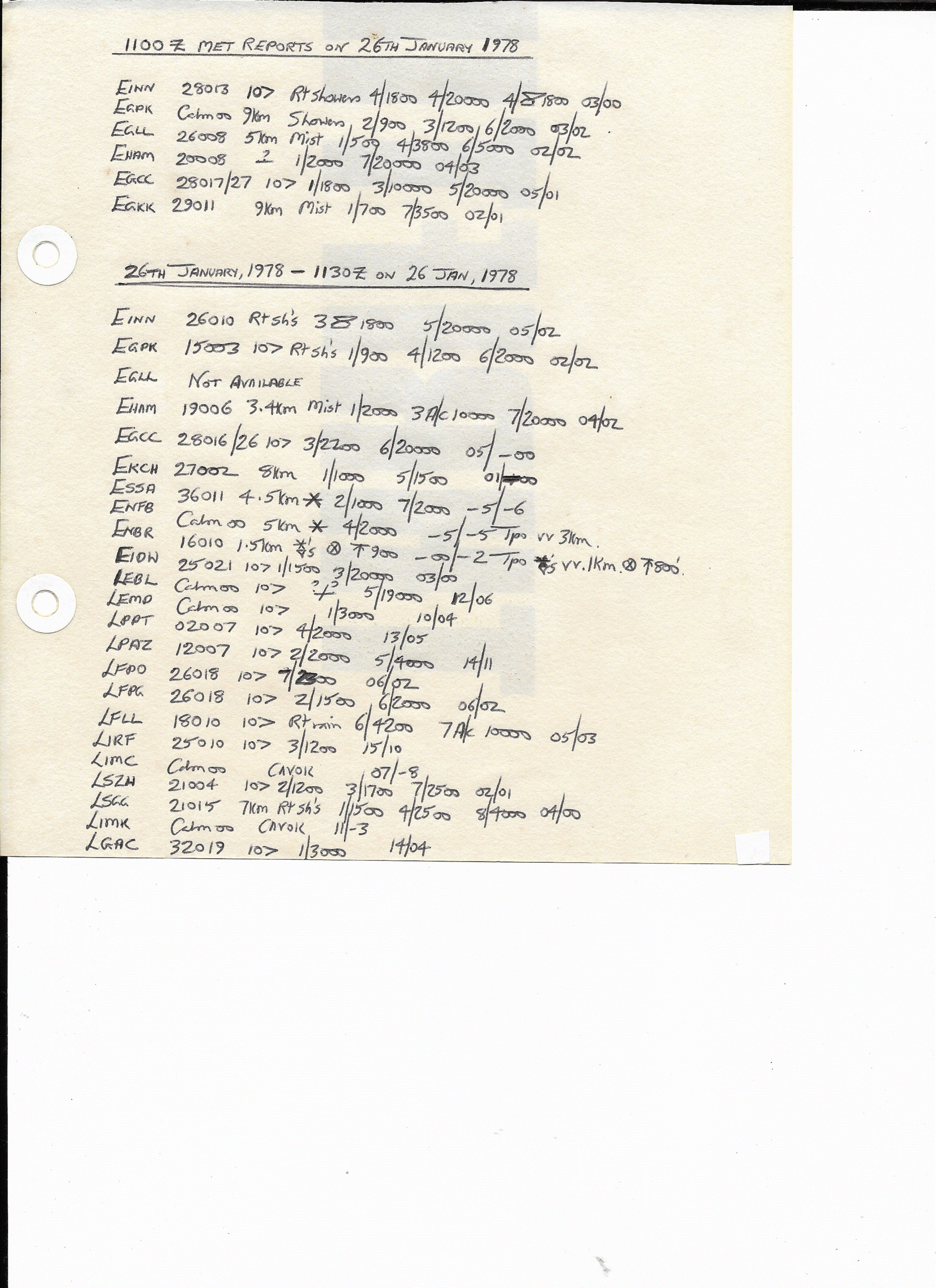 26 January, 1978: 1100Z & 1130Z European METARS