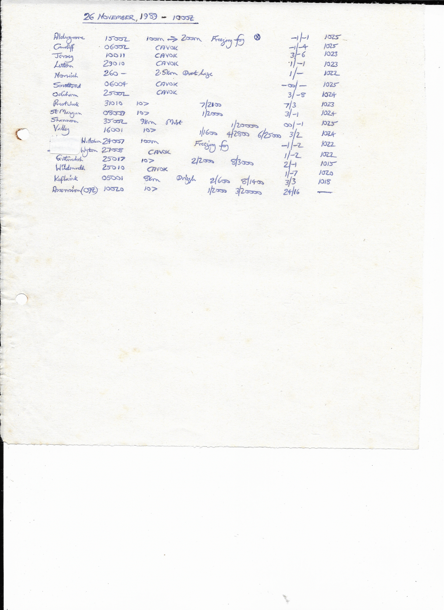 26 November, 1989: 1000Z Met. Station Reports