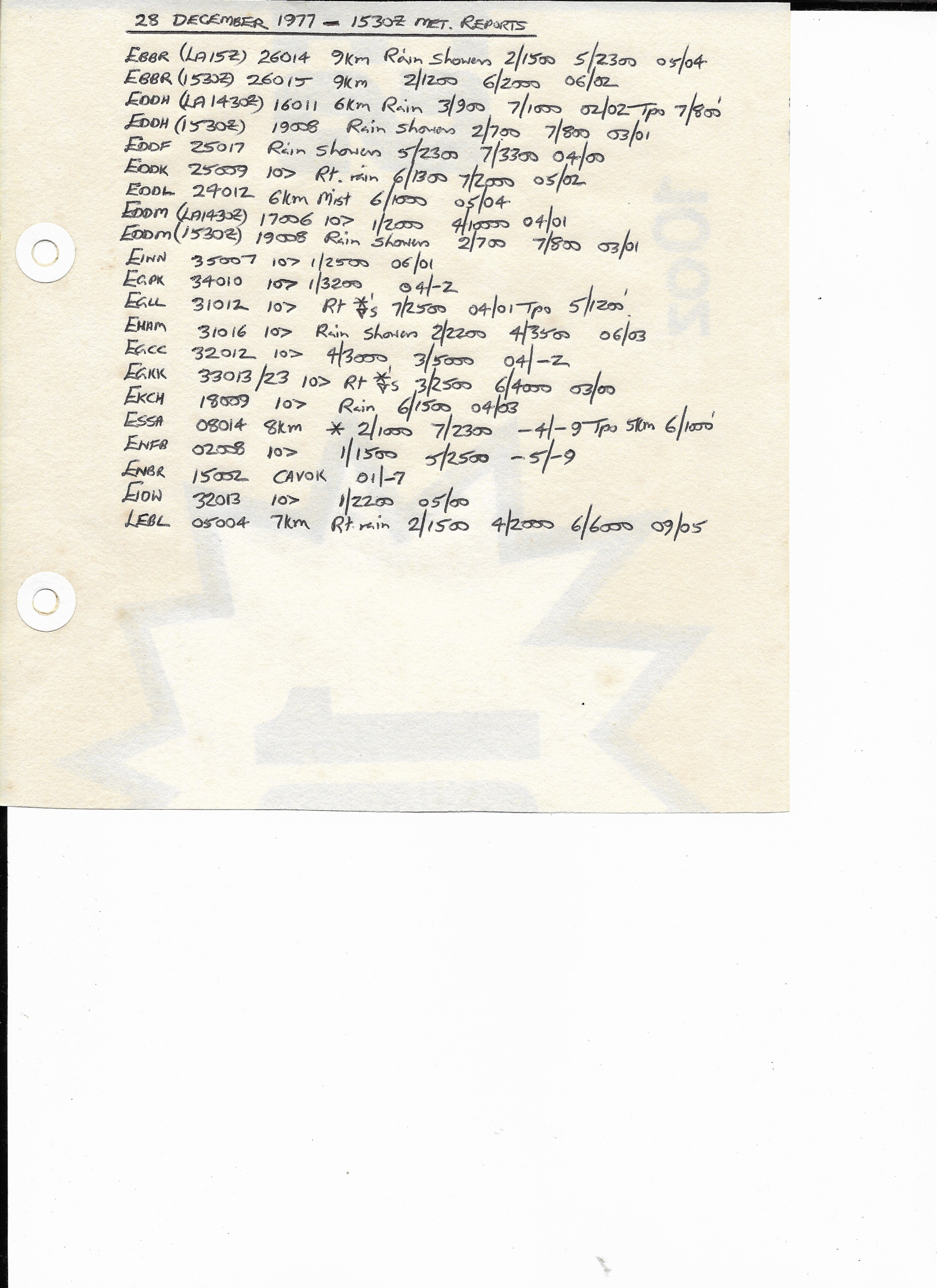 28 December, 1977: 1530Z European METARS
