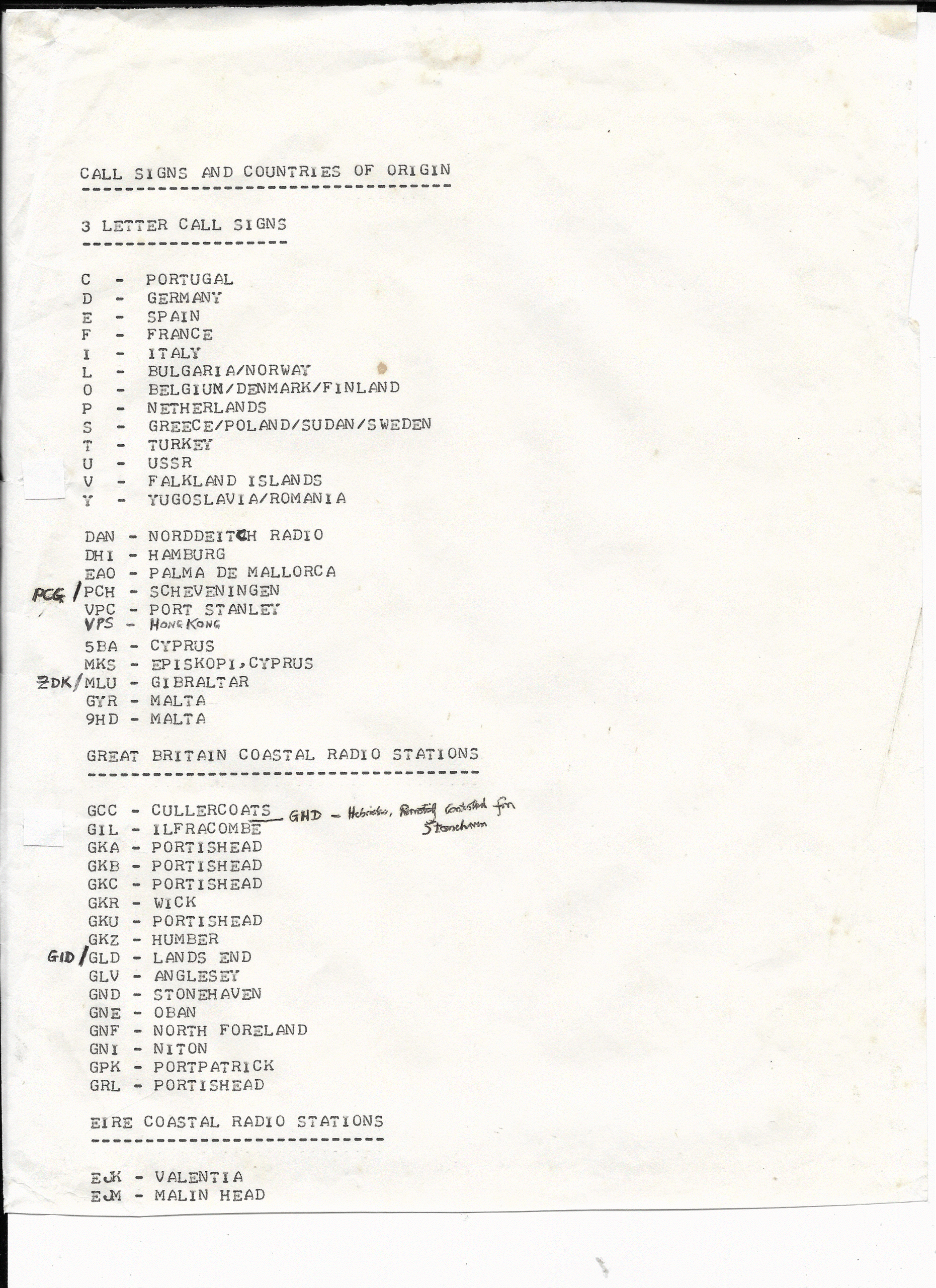 Call Signs & Countries Of Origin & Great Britain & Eire Coastal Radio Stations: