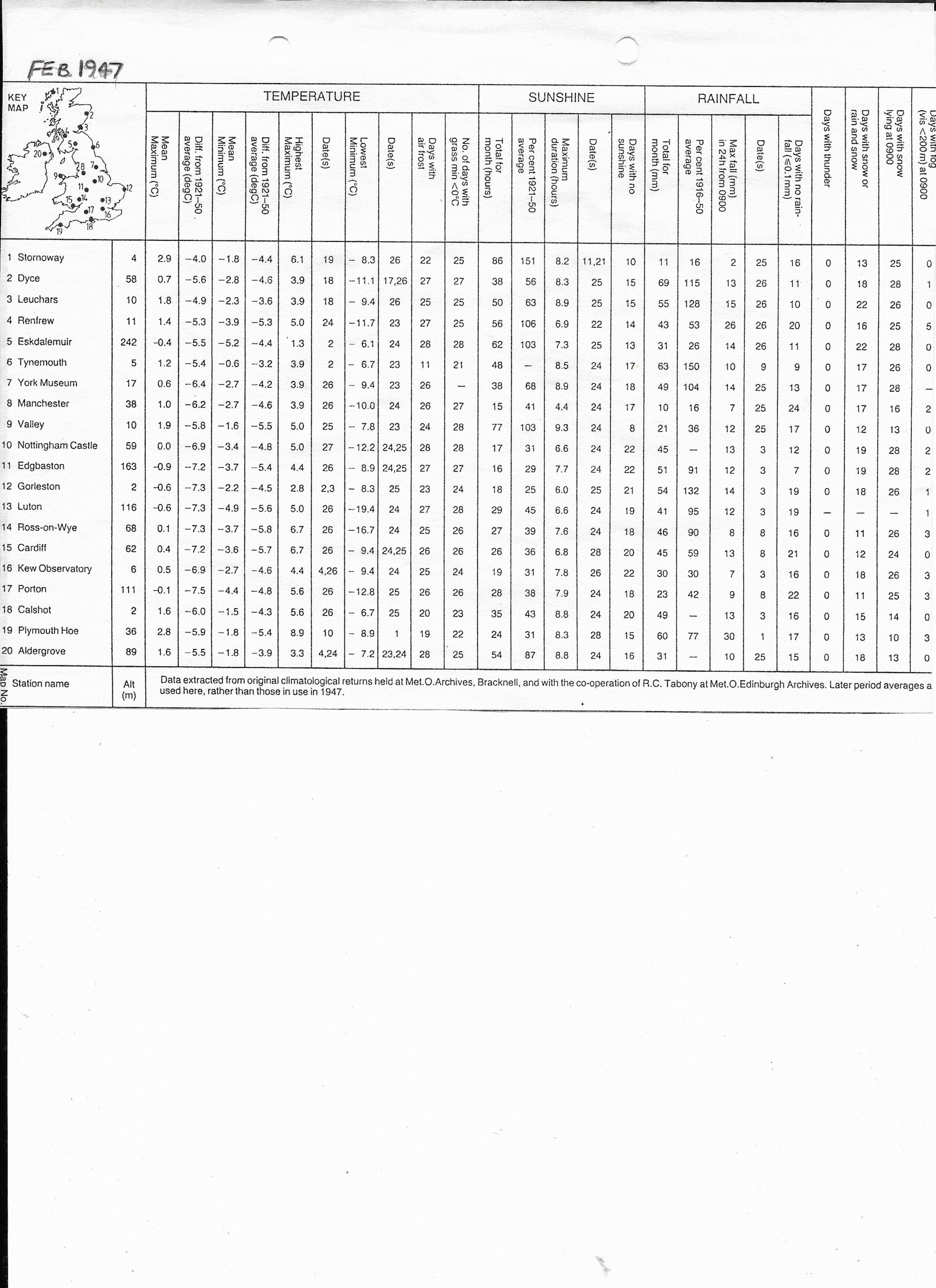 February 1947: U.K. Temperature, Sunshine & Rainfall Data