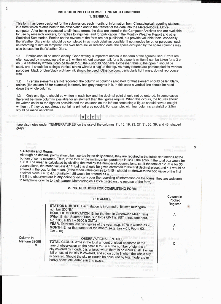 General, including: Totals & Means and Instructions for completing form: Station Number, Obs. Hour, Year, Month, Total Cloud: Pages 2 & 3: