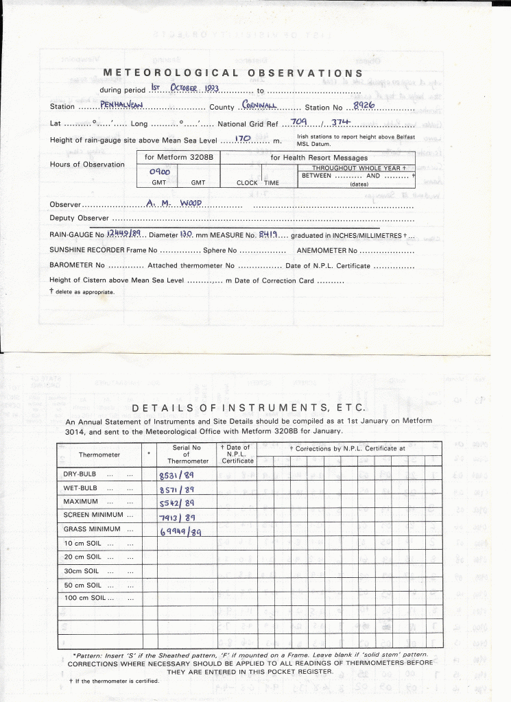 Meteorological Observations & Details Of Instruments, Etc Penhalvean: 01st October, 1993