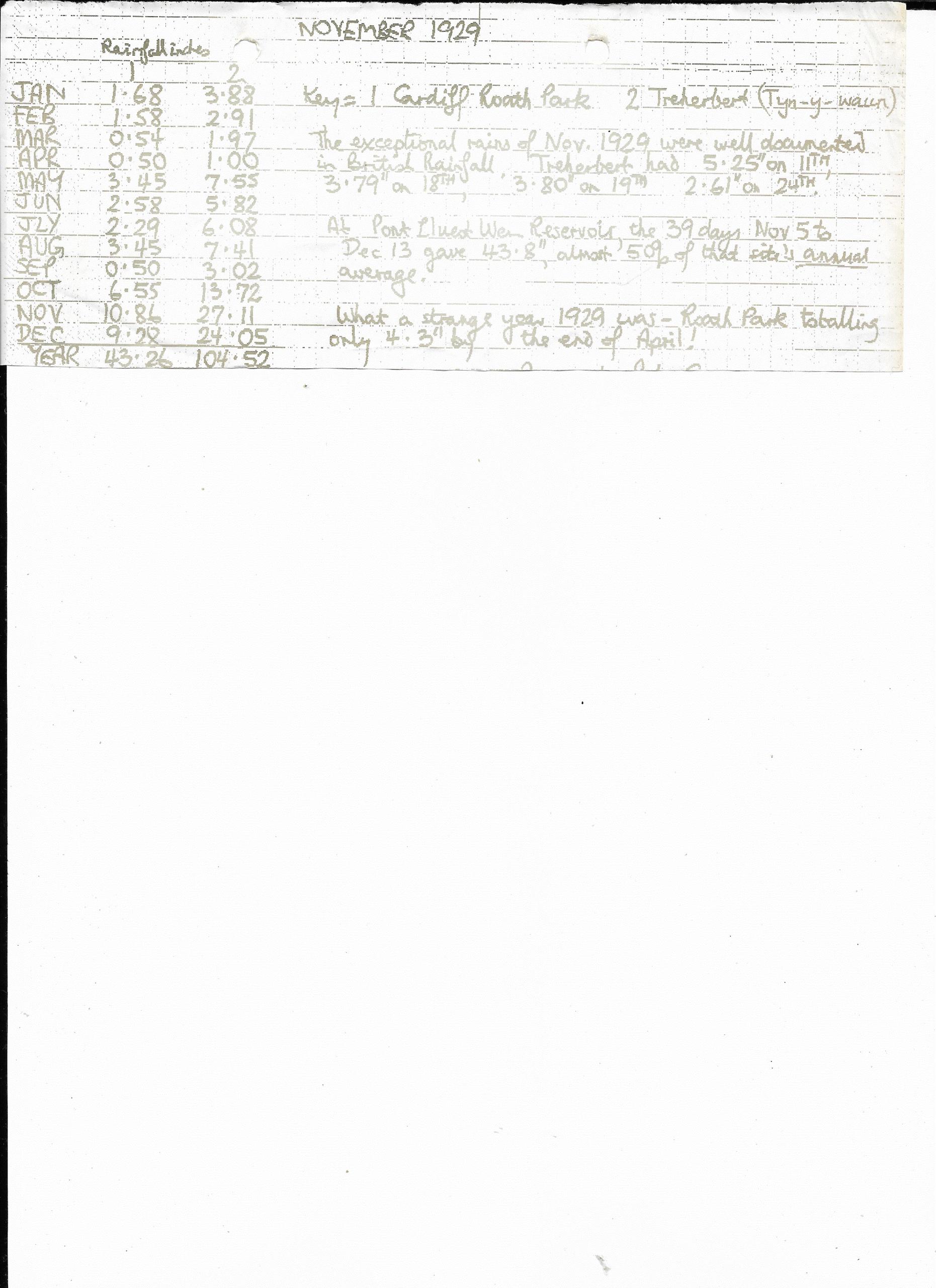 November 1929: Cardiff Roath Park & Treherbert Rainfall Totals