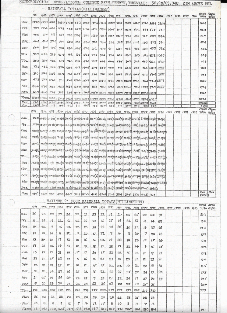 Penryn Rainfall Totals, Max 24 Hr Rfl & Monthly Days With Rain 1971-1986 & Means 1971-1980