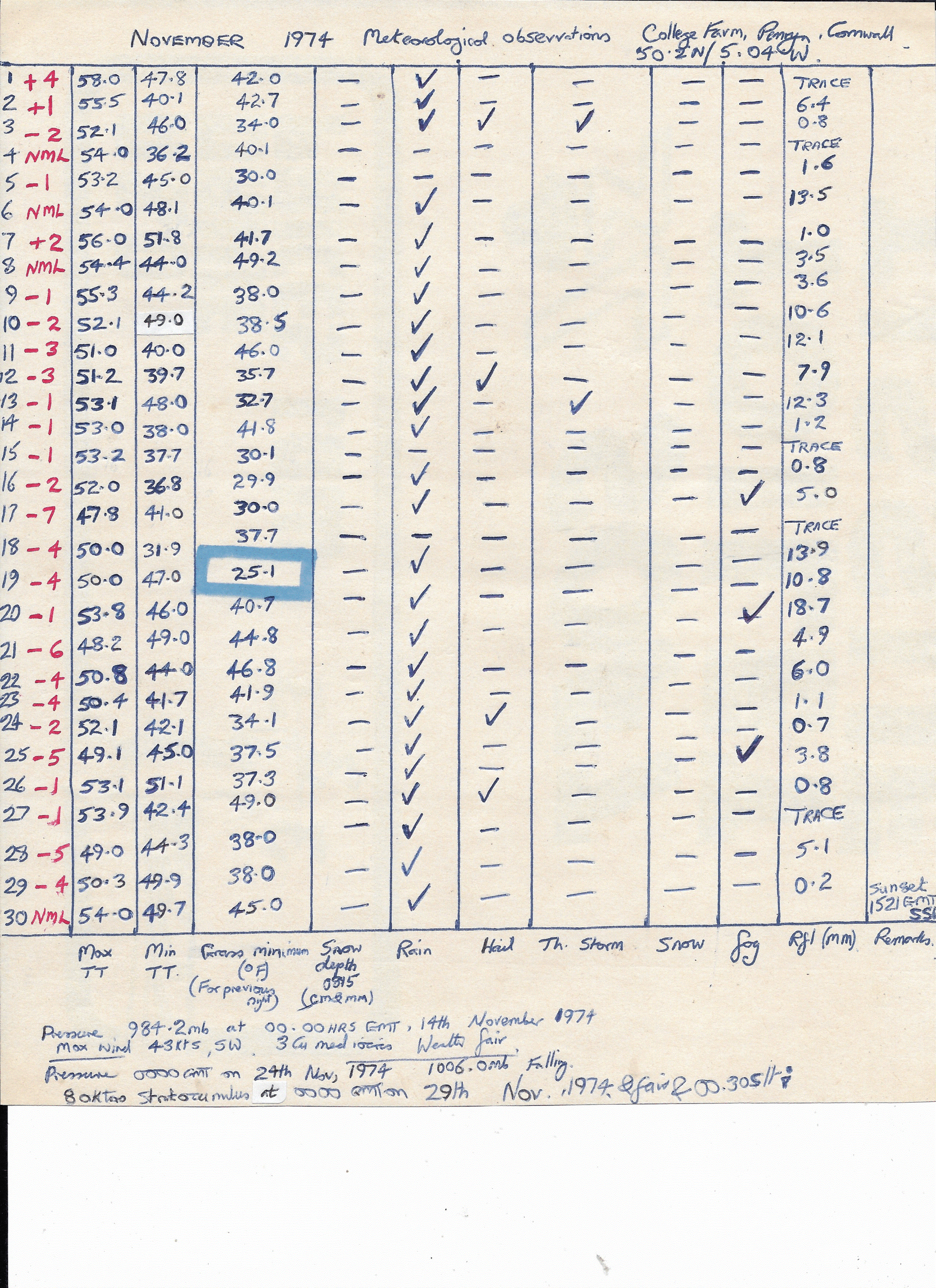 Penryn Weather data: November 1974