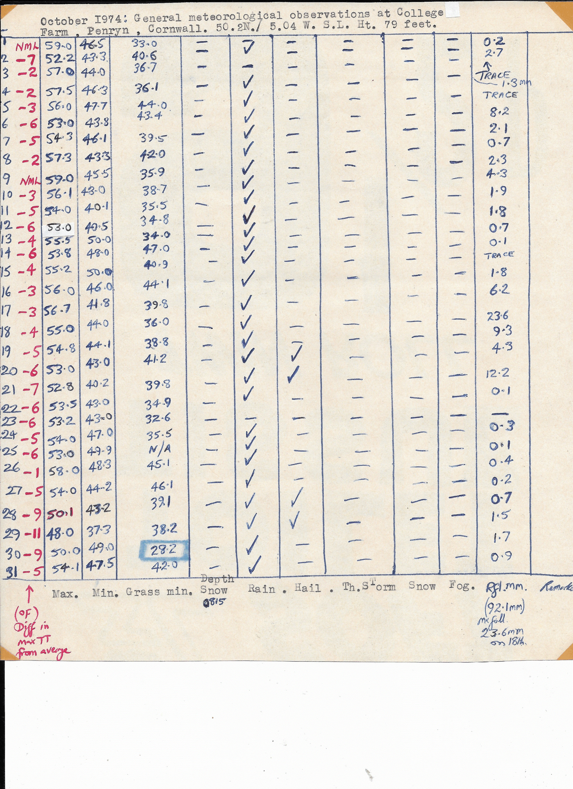 Penryn Weather Data: October 1974