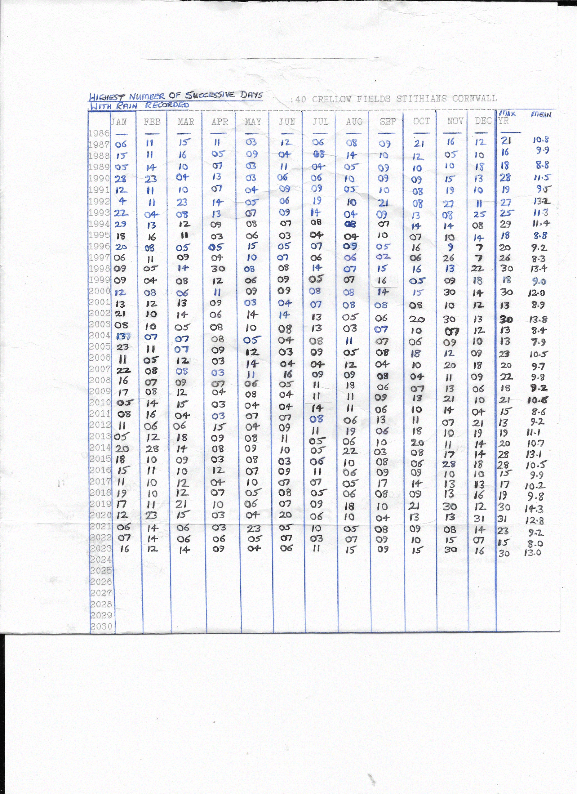 Stithians Monthly Highest Number Of Successive Days With Rain Recorded 1987-2023