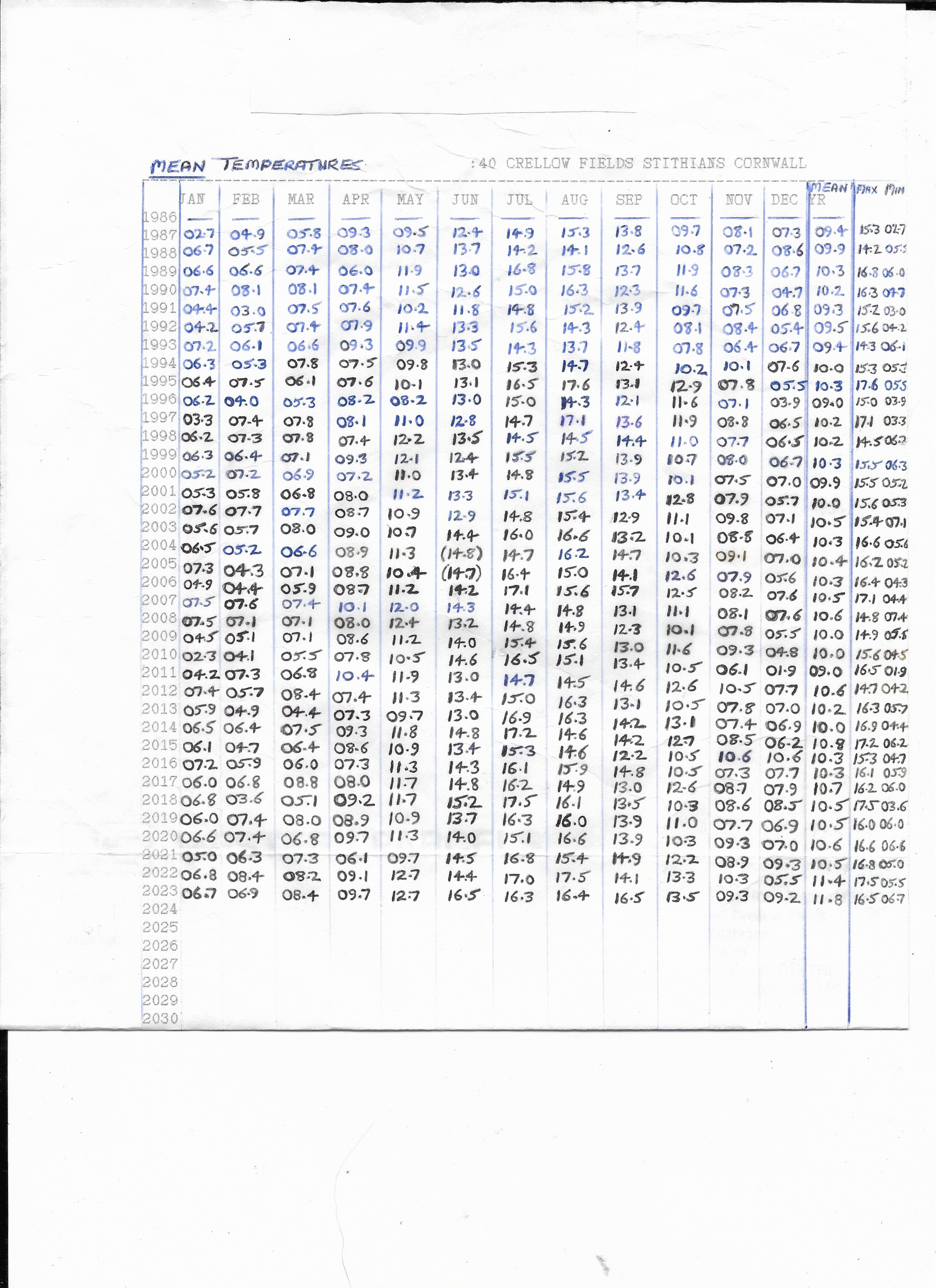 Stithians Monthly Mean Temperatures 1987-2023