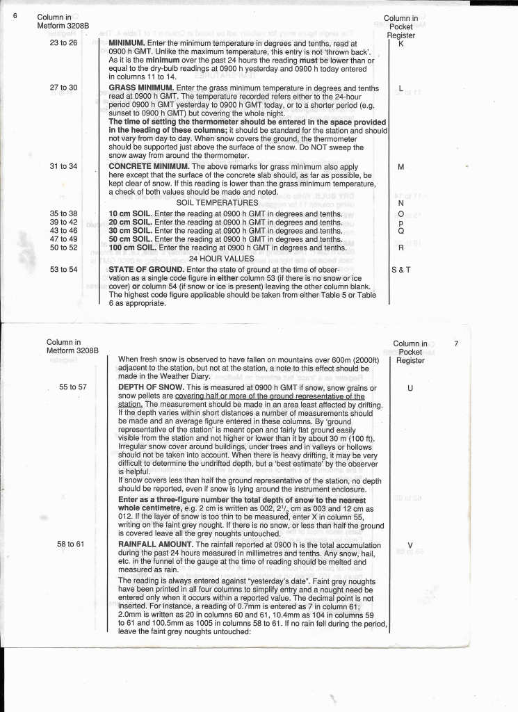 Temperatures: Minimum, Grass Minimum, Concrete Minimum, Soil Temperatures, State of Ground, Depth of Snow & Rainfall Amount: Pages 6 & 7